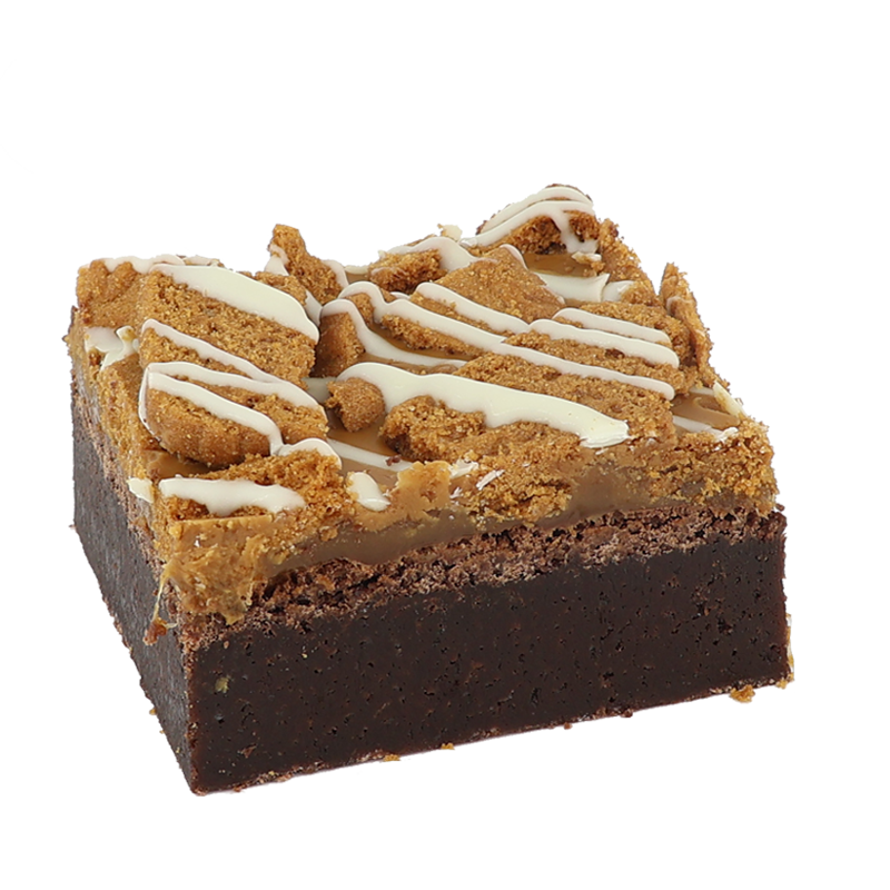 Chocolate brownie with biscoff spice, topped with caramel, biscoff spread, chunks of biscoff biscuits and a white chocolate drizzle.