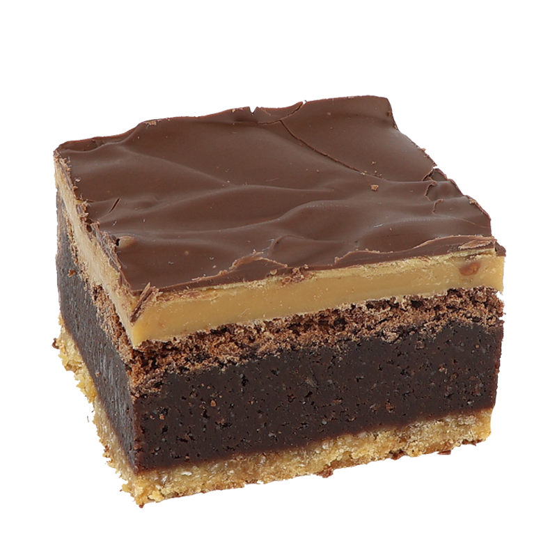 Inspired by an Aussie bakery classic, we start with a biscuit base, topped with chocolate brownie, a thick layer of dulce de leche caramel and finished with a layer of chocolate.