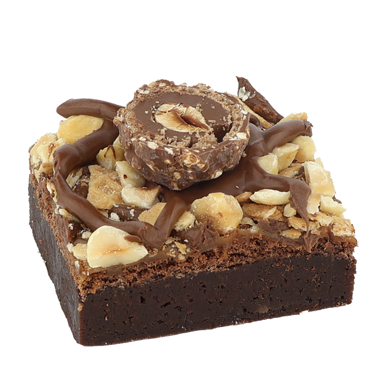 Chocolate brownie topped with caramel, nutella, roasted hazelnuts, wafer pieces and chunks of Ferrero Rocher.