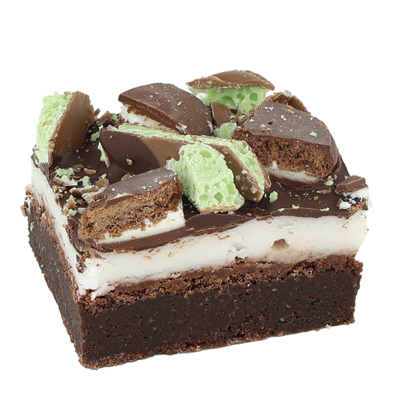 Chocolate brownie topped with a layer of mint filling, dark chocolate, mint aero chocolate and mint slice biscuits.