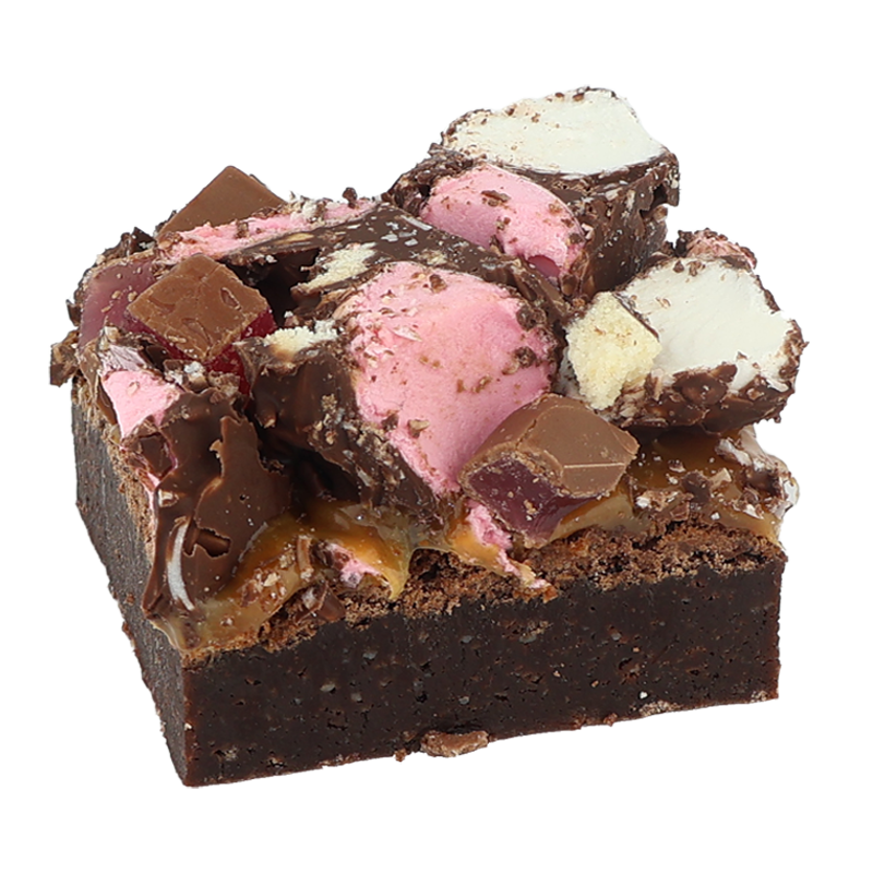Chocolate brownie topped with caramel, chunks of Turkish Delight, and decadent rocky road with marshmallows, shredded coconut and scotch finger biscuits.