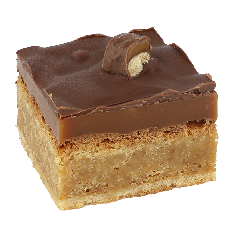 Shortbread base topped with white choc blondie, a thick layer of chewy caramel, milk chocolate and a chunk of Twix.